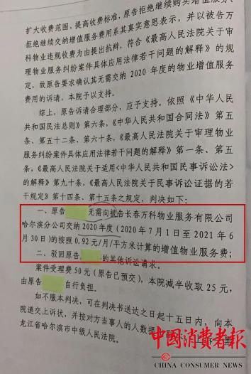 日前,哈尔滨市香坊区法院作出一审判决,用户无需向万科物业交纳2020年度增值物业服务费,但对于已交费用的法院没有支持返回。对于赢了“一半”的判决,消费者并不认同,已提起上诉,要求法院认定万科物业加收2019年度增值物业服务费无效,予以返回。