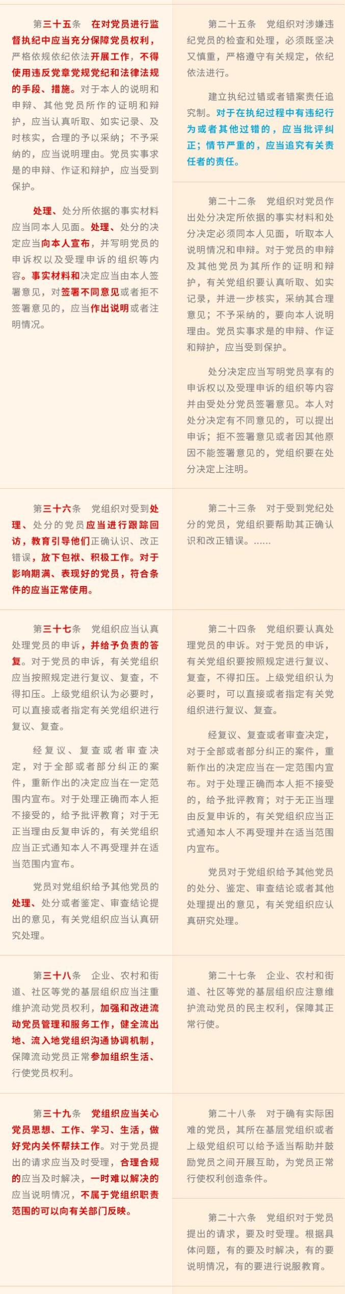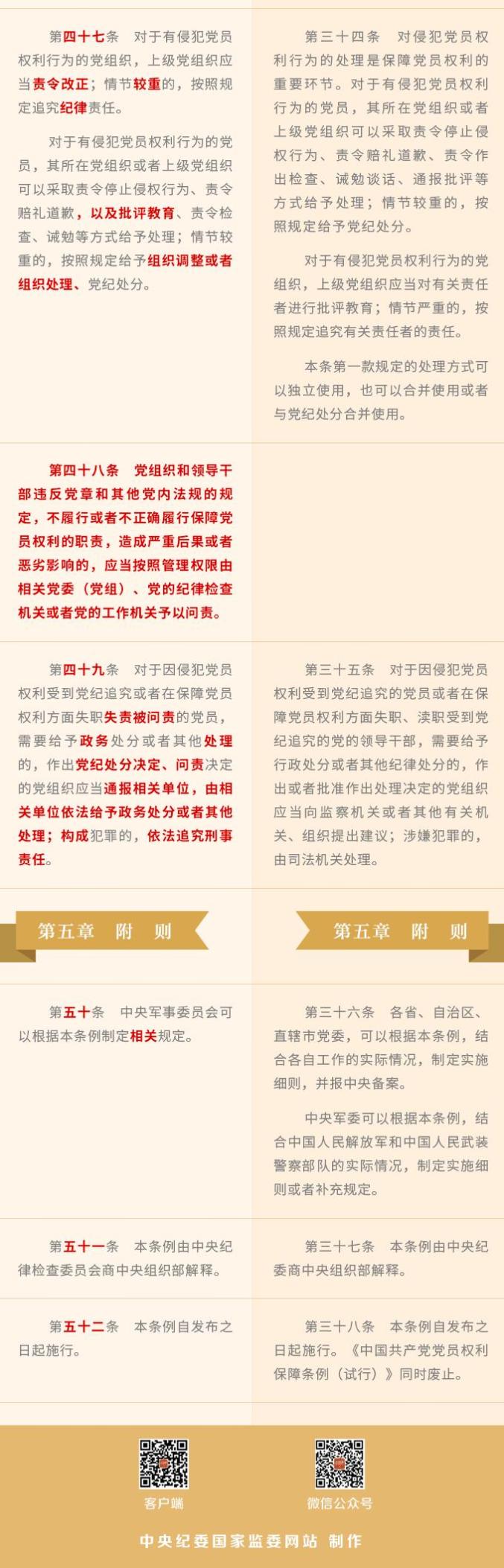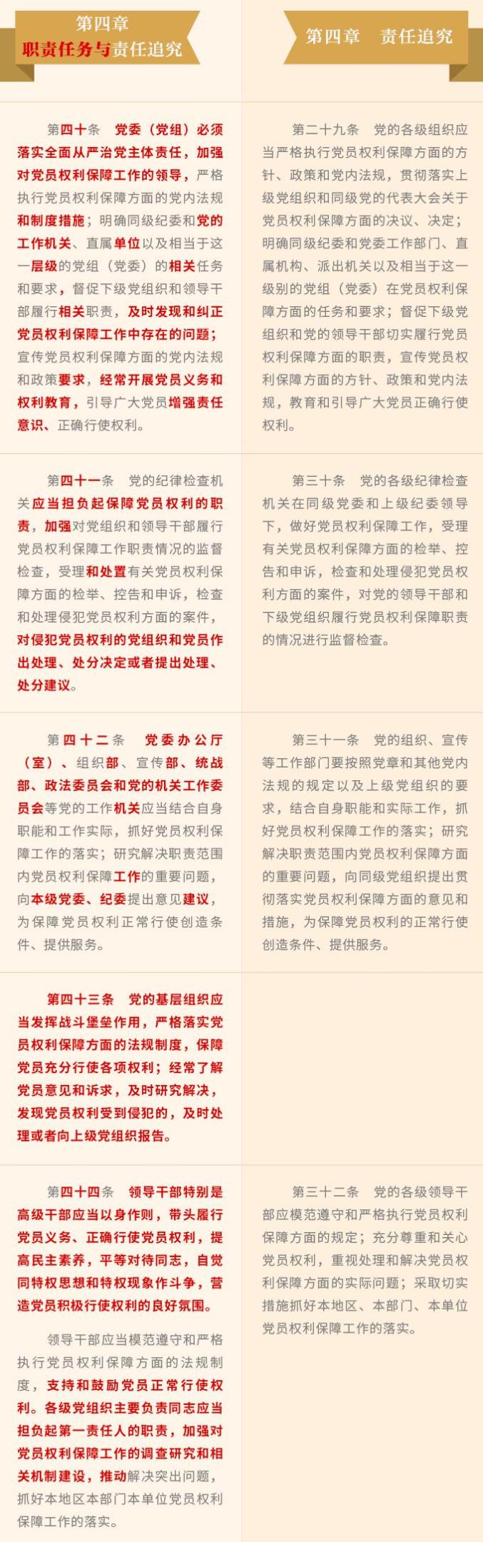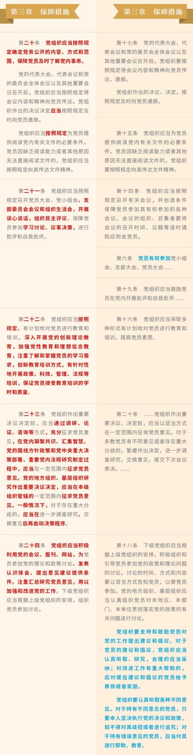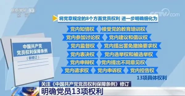 修订后的《条例》共5章52条,在“总则”中将坚持党的领导、加强党的建设作为根本目的,强调发扬党内民主、尊重党员主体地位,并且将“坚持义务和权利相统一”作为党员权利保障应当遵循的重要原则,《条例》将党章规定的8个方面党员权利,进一步明确细化为党内知情权、接受党的教育培训权、党内参加讨论权、党内建议和倡议权、党内监督权、党内提出罢免撤换要求权、党内表决权、党内选举权和被选举权、党内申辩权、党内提出不同意见权、党内请求权、党内申诉权、党内控告权等13项具体权利。同时,划出权利边界,要求党员行使权利应当按照组织原则,符合有关程序等。