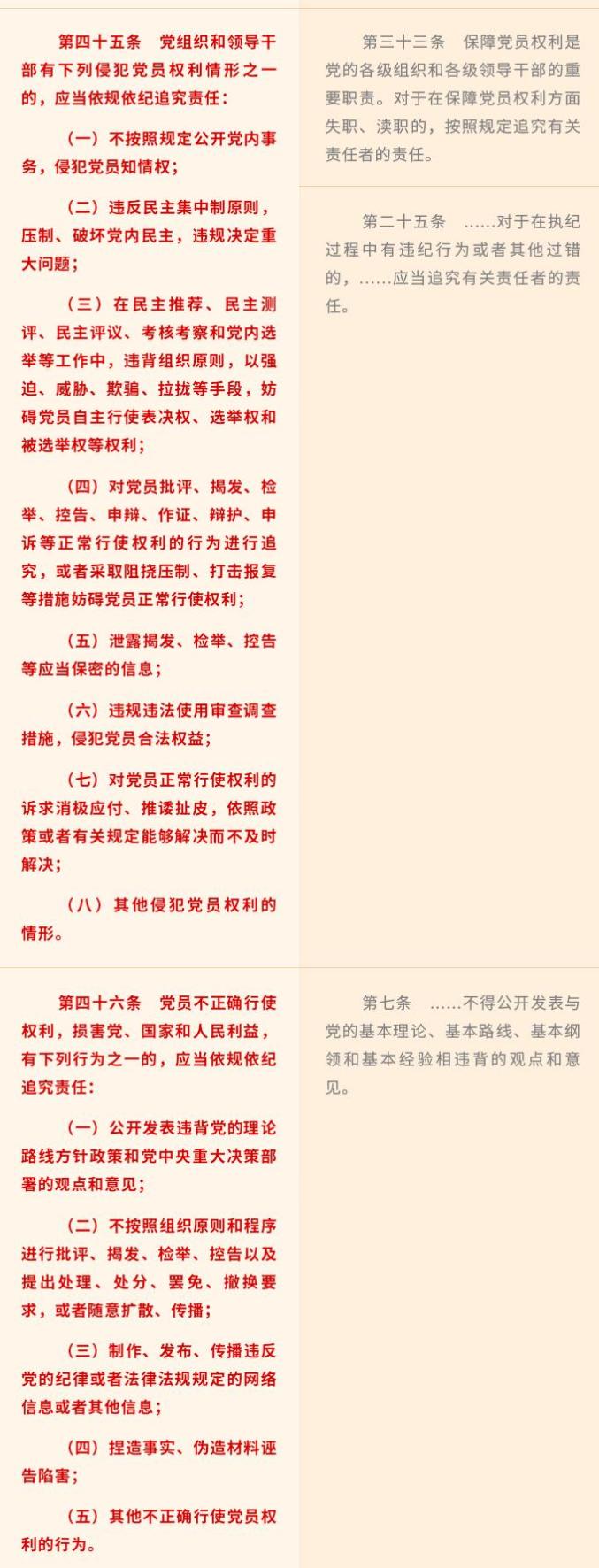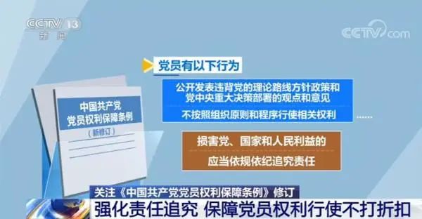 同时,《条例》也对党员不正确行使权利、滥用权利的行为作了梳理,集中列明了党员不正确行使权利的情形,规定党员有公开发表违背党的理论路线方针政策和党中央重大决策部署的观点和意见、不按照组织原则和程序行使相关权利等行为,损害党、国家和人民利益的,应当依规依纪追究责任。对于存在上述行为的党员,应当根据错误性质和情节轻重,按照规定给予批评教育直至纪律处分。