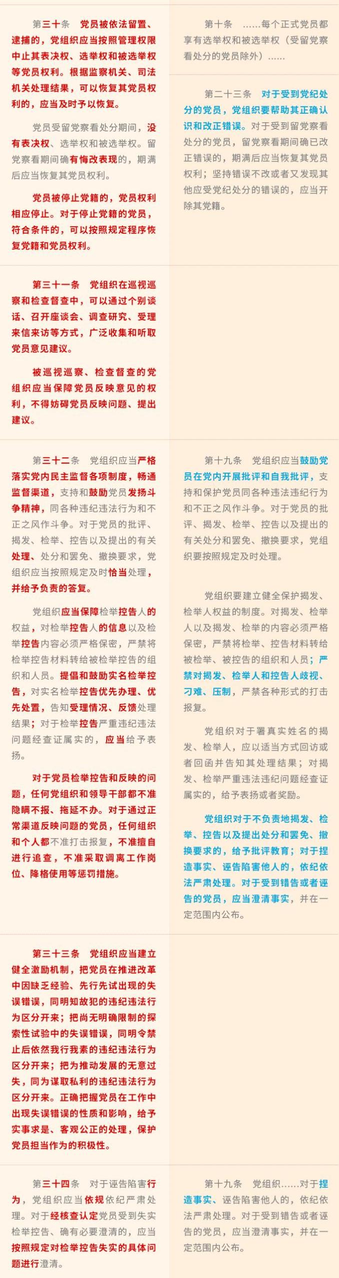 针对社会关注的防范和查处诬告陷害行为、健全容错机制等问题,在此次《中国共产党党员权利保障条例》修订中,对这些内容都作了规定。