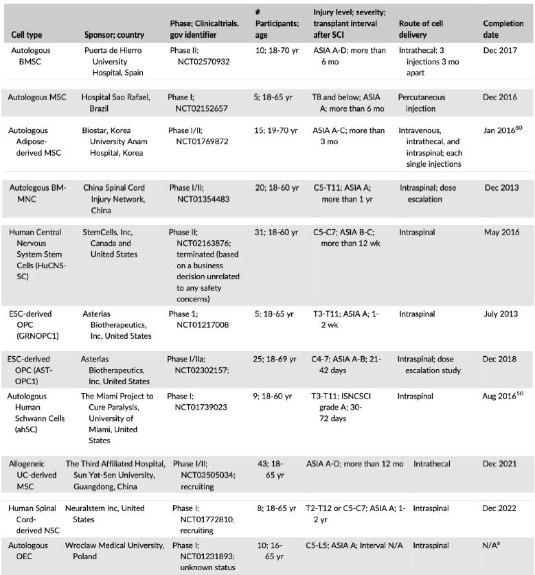 <如神经元和少突胶质细胞等>,促进脊髓损伤空洞区形成桥接,引导神经再生、调节免疫微环境、修复脊髓中非神经组织等促进神经损伤恢复。如神经元和少突胶质细胞等>目前全球在研的干细胞治疗脊髓损伤临床试验项目,使用了骨髓间充质干细胞、脂肪干细胞、脐带间充质干细胞、神经细胞、少突胶质前体细胞、自体施旺细胞、自体嗅鞘细胞。根据美国国立卫生研究院(NIH)全球最大的临床研究数据库ClinicalTrials上注册的信息统计,细胞治疗脊髓损伤临床试验项目有57项,其中大部分处在1期,有些处在2期。