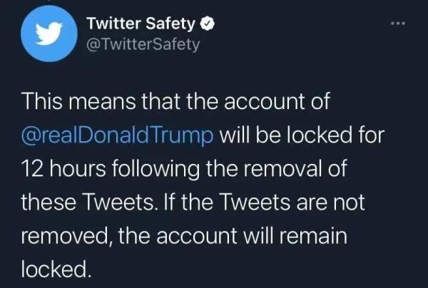 据美联社报道,推特公司将冻结现任美国总统特朗普的推特账号至少12小时。此前,推特曾删除特朗普回应美国国会抗议活动的几条推文。