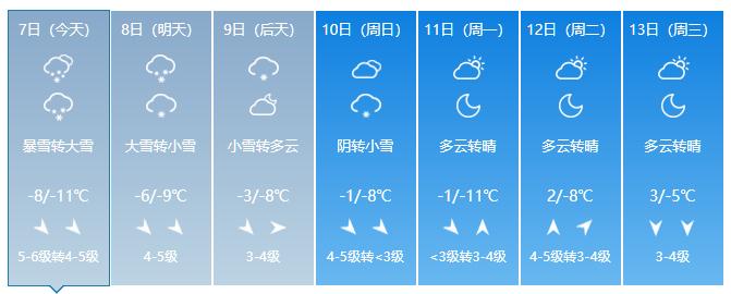 今天白天到夜间,阴有大到暴雪,西北风6~7级阵风8级夜间逐渐减弱到5~6级,-8℃~-11℃;明天白天到夜间,阴有大雪,局部暴雪,西北风5~6级,-6℃~-9℃;9日,阴有小雪转多云,西北风5~6级转西风4~5级,-3℃~-8℃。