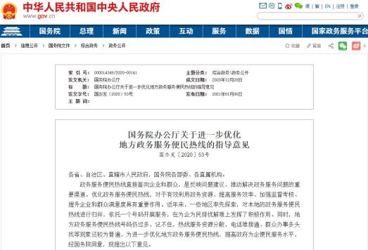 1月6日,国务院办公厅发布指导意见提出,2021年底前,各地区设立的政务服务便民热线以及国务院有关部门设立并在地方接听的政务服务便民热线实现一个号码服务,归并统一为“12345政务服务便民热线”,语音呼叫号码为“12345”,提供“7×24小时”全天候人工服务。