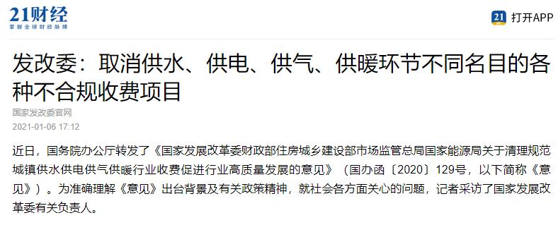 近日,国务院办公厅转发了《国家发展改革委财政部住房城乡建设部市场监管总局国家能源局关于清理规范城镇供水供电供气供暖行业收费促进行业高质量发展的意见》(国办函〔2020〕129号)。《意见》坚持目标导向和问题导向,就清理规范供水、供电、供气、供暖行业收费,促进行业高质量发展提出了5方面24项政策措施。其中包括:清理取消不合理收费。取消供水、供电、供气、供暖环节不同名目的各种不合规收费项目。明确除法律法规和相关政策另有规定外,不得由用户承担建设项目建筑区划红线外发生的任何费用。新建商品房、保障性住房等建筑区划红线内供水供电供气供暖管线及配套设备设施的建设安装费用纳入房屋开发建设成本,不得另外向买受人收取。