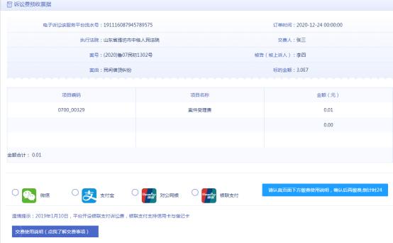 当事人可选择微信、支付宝、对公网银或银联支付等支付方式进行交费。