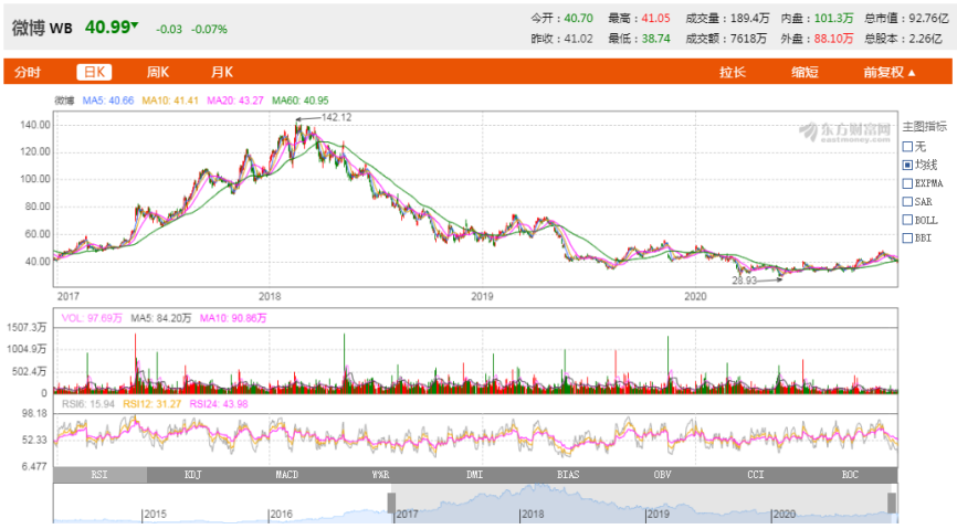 从2017年开始,微博股价一路上涨,到2018年一季度触达142美元的高位,然而此后便进入了长达近三年的下行通道。