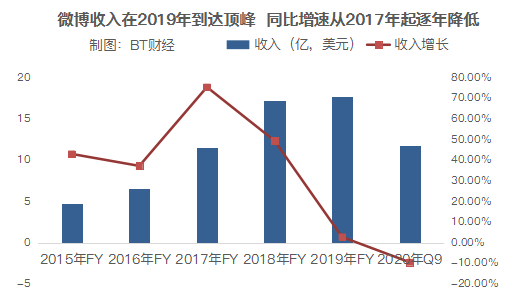 最新的财报数据显示,2020年第三季度,微博的营收录得4.657亿美元,同比微降0.43%;前三季度累计营收11.77亿美元,累计同比降低9.41%。
