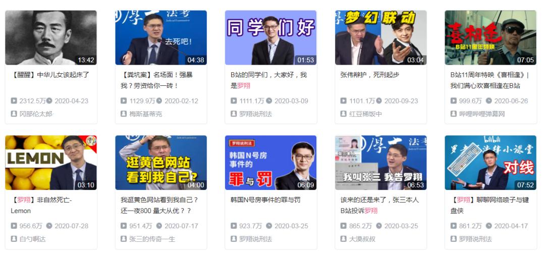 在B站上搜索罗翔,点击量最高的10条视频里,一半以上都是别人的剪辑。