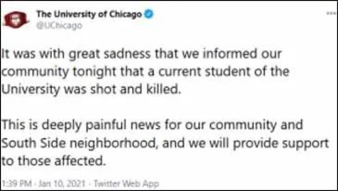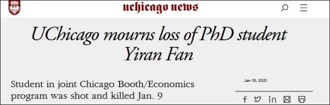 芝加哥大学最早证实了范轶然的身份。1月10日,芝加哥大学布斯商学院公告称,受害者范轶然是该学院经济金融四年级的博士生,本有计划在今年晚些时候提交论文。目前,他在中国的家人已经接到这个消息。