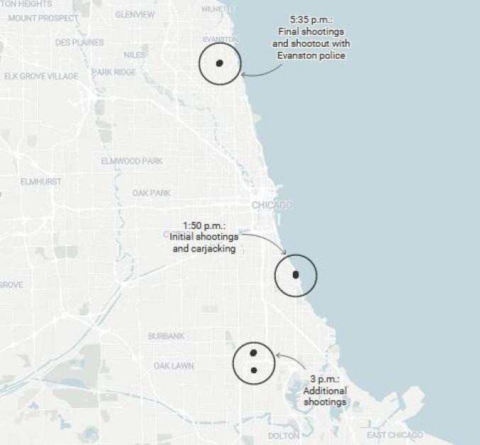 此时,警方已经知道南丁格尔驾驶着一辆红色丰田车,但在“没有监控”的情况下始终无法定位车辆的位置。《芝加哥论坛报》称,南丁格尔开车沿途随意向人开枪,而警方始终在他身后一步。