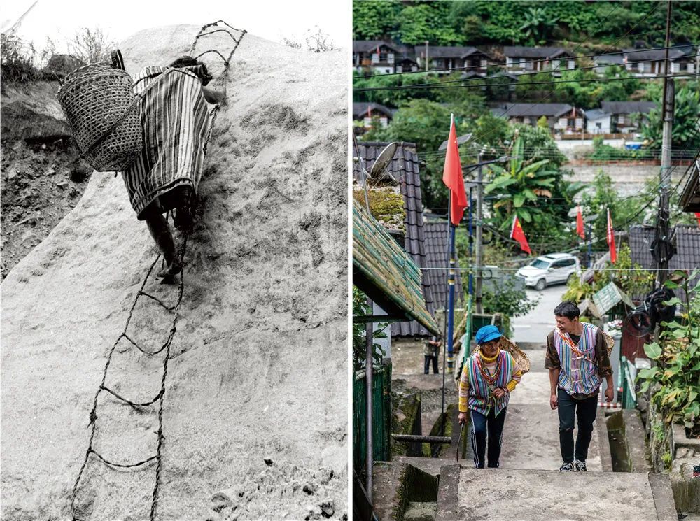 拼版照片左图:解放前,独龙族群众出行需要爬天梯(资料照片);右图:2020年10月31日,独龙族青年李永明和奶奶出门去山上割猪草(新华社记者胡超摄)。新华社发