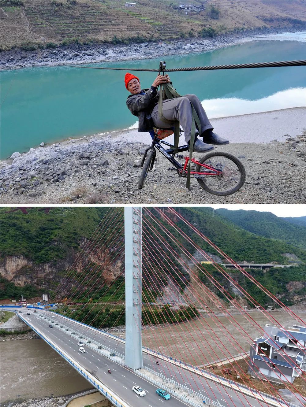 拼版照片上图:2013年2月2日,在怒江傈僳族自治州泸水县六库镇双米地村辣子咪村民小组,一名傈僳族男子带着自行车溜索过怒江(新华社记者 蔺以光 摄);下图:2016年9月9日拍摄的怒江傈僳族自治州的双向六车道大型公路跨江桥梁——通达桥(新华社记者 胡超 摄)。新华社发