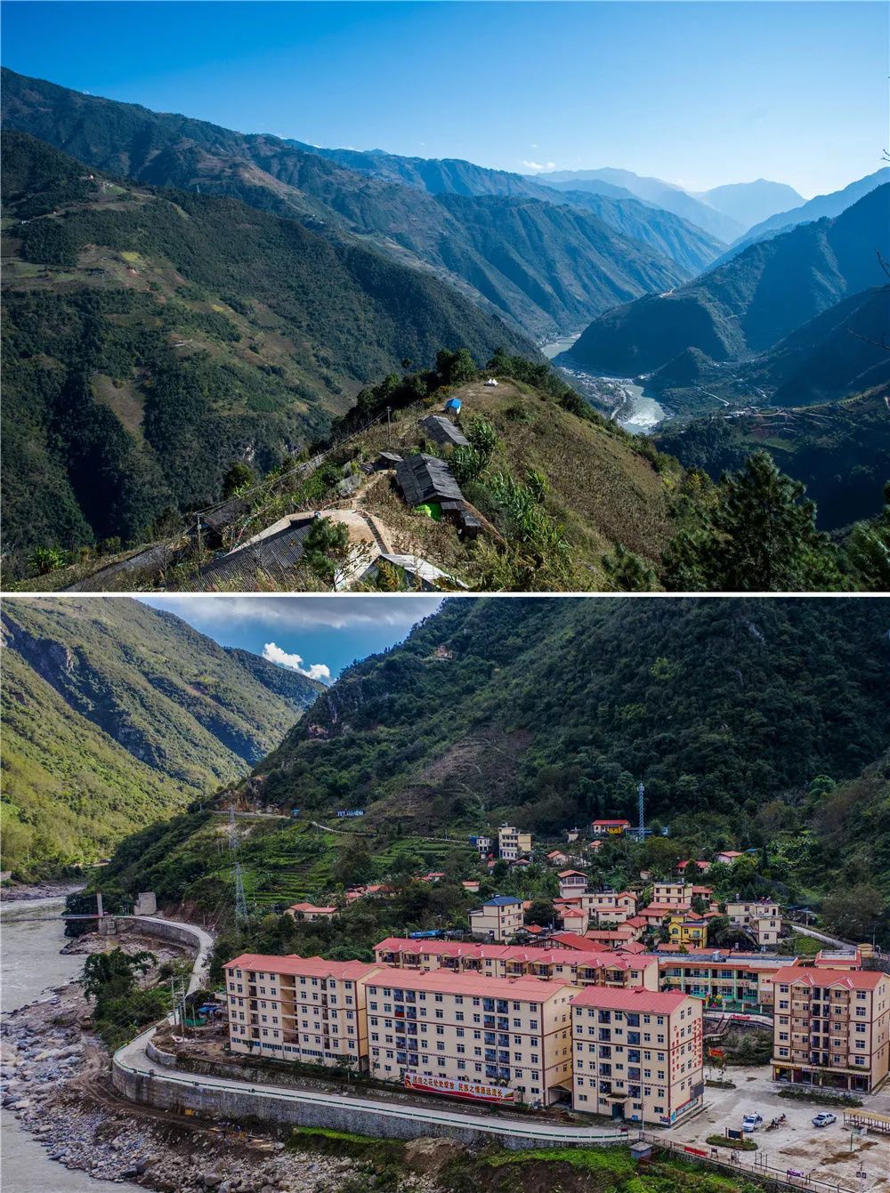 拼版照片上图:云南省福贡县匹河怒族乡托坪村一景(2016年11月25日摄);下图:搬迁到怒江边的托坪村五湖易地扶贫搬迁安置点新村(2020年11月3日摄,无人机照片)。新华社记者 胡超 摄