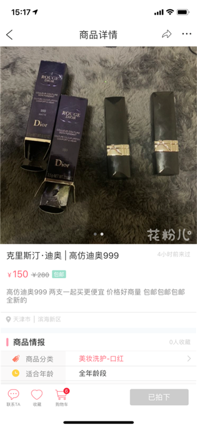 发布会现场,记者看到了一支体验员在某二手交易平台上购买的“DIOR”口红,“卖家明确说明不是正品,且平台发布的商品信息也注明了‘高仿’字样。”口红的包装盒是破损的,膏体有缺口,分量轻,体验人员怀疑产品包装是使用过的真品包装盒。与客服私聊中询问到是否是高仿,卖家明确回答不是真的。但这些标题和聊天中明确的售假信息,平台并没有进行监测,或进行相应处理。