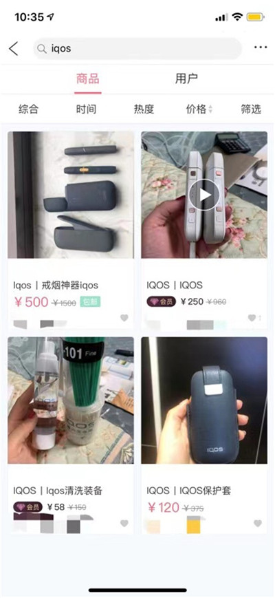 体验人员在一平台输入“电子烟”没有直接在售电子烟,但输入具体的品牌(如:iqos)可以看到销售电子烟,且相关信息不止一条。