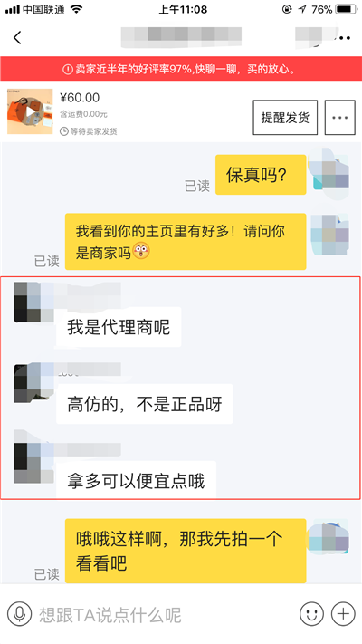 体验人员在闲转平台咨询售卖假货问题时,平台客服回答称有假货可以举报,但如果卖家注明是假货、高仿,买家不介意就行,还表示一般正品不会在此平台购买。