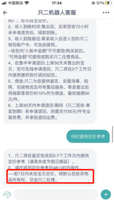 有消费者反映,部分平台规定如果卖家未在一定时间定价,将丧失物品所有权,类似规定极易引发消费争议和纠纷投诉。在本次体验中,奢侈品二手交易平台有红布林、花粉儿、心上、只二、万表。其中,只二寄卖规定由卖家自主定价,但平台规定若7日内未给定价,将默认放弃物品所有权,交由只二处理。若寄卖期间届满后30天内未作出任何操作,默认放弃闲置物的所有权,授权交由只二处理闲置物。红布林寄卖服务中规定鉴定后24小时内卖家不定价将由平台定价,如选择极速/中速变现,价格调整也都将由平台操作。