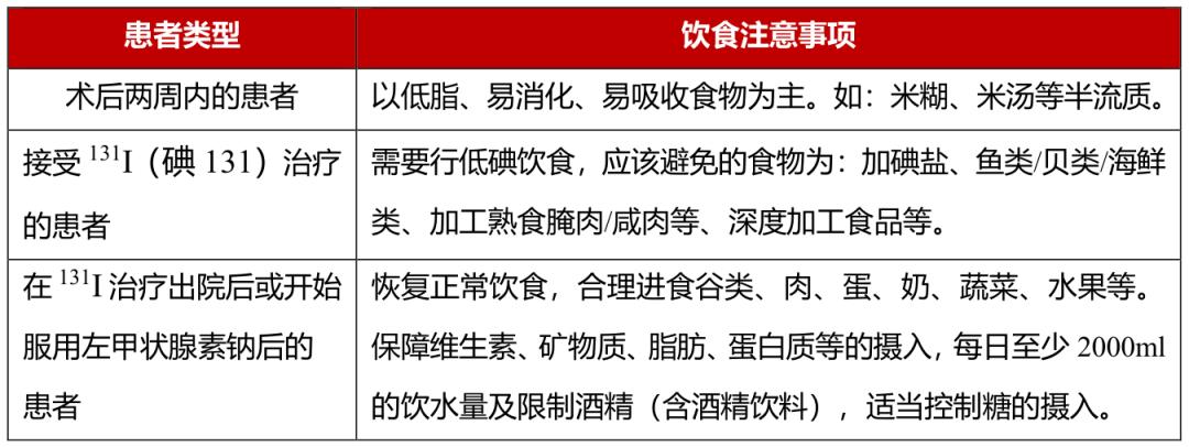 表1甲状腺癌术后的患者在不同时期的饮食建议
