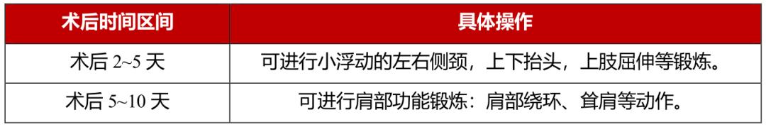 在排除术后出血高危因素和充分评估患者个体健康风险的基础上,建议术后早期进行适当的颈部功能锻炼可以促进切口愈合。具体时间及步骤见(表2)。
