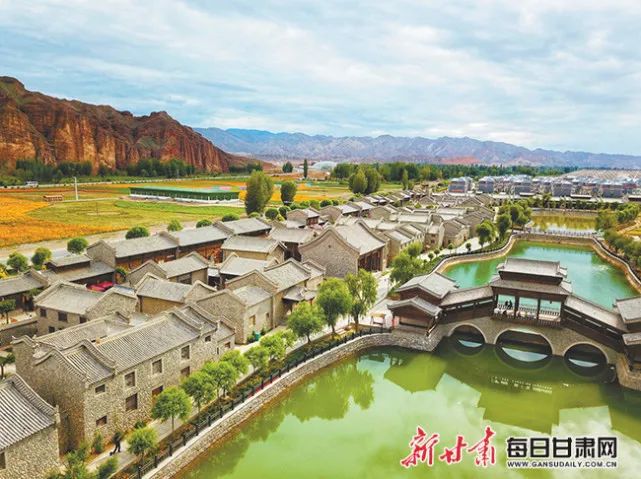 石墙灰瓦、飞檐斗拱……徽派建筑和西北建筑风格的完美结合,使张掖临泽县丹霞口文旅小镇景区既有南方的婉约秀丽、玲珑精致,又具西北雄浑粗犷的豪迈气势,是一处集特色美食、情景商业、民俗文化、会议会展、精品民宿、主题演艺于一体的特色文旅小镇。所谓“不望祁连山顶雪,错把小镇当江南”,便是游客对丹霞口文旅小镇的印象。