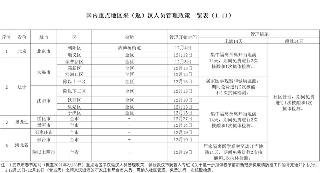 武汉:重点地区人员,14天集中隔离+2次核酸1次抗体检测