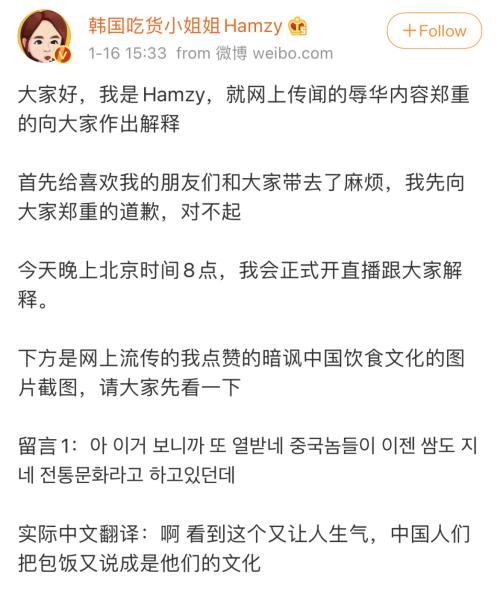 1月16日,有网友指出,微博粉丝超过303万的美食博主@韩国吃货小姐姐Hamzy 在Youtube上点赞了韩国网友的“辱华”言论,其中包括暗讽中国人“抢”包饭、泡菜为中国美食的评论,机翻相关语句后,甚至出现了“中国鬼子”的侮辱性词汇。