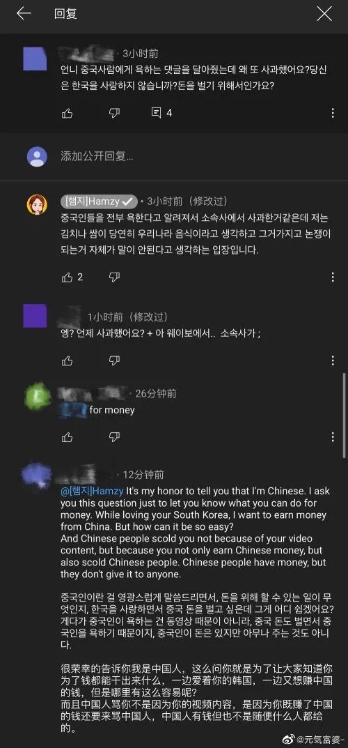 遭中国网友质疑“双面人”后,Hamzy及其中国公司火速上线道歉,但道歉完,就被网友发现Hamzy又去Youtube留言“泡菜和包饭当然是韩国的”。