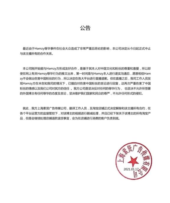 1月17日晚,Hamzy的中国合作公司发布公告宣布与其解约,称将删减该博主的所有视频,店铺商品也将全部下架。