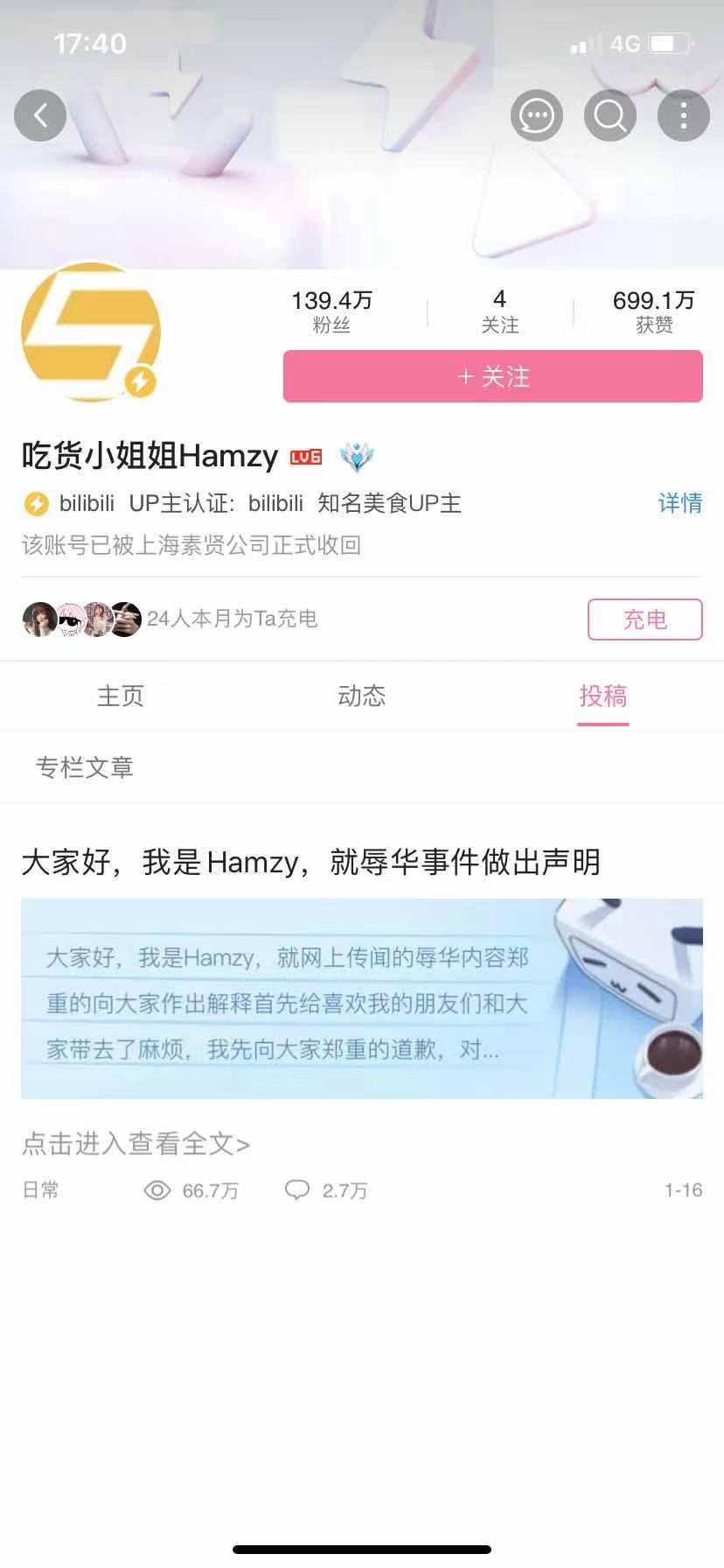 目前,其B站账号“吃货小姐姐Hamzy”发稿内容已被全部清空,并显示:该账号已被上海素贤公司正式收回。