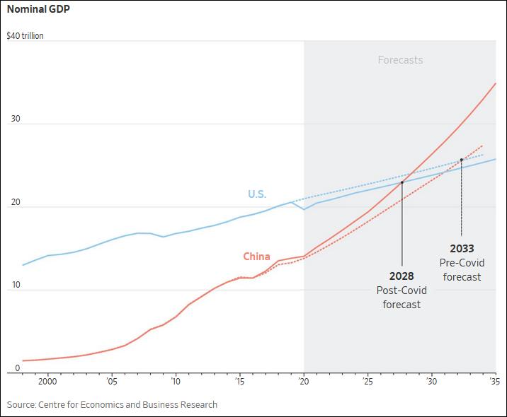 而总部位于伦敦的研究机构“经济与商业研究中心”(CEBR),同样也认为这一天会提前至2028年到来,此前,这一预测结论已在去年底被彭博社第一时间报道。与韦伯的个人预测不同,该机构在新冠疫情暴发前,原本预测中国经济会在2033年超越美国。