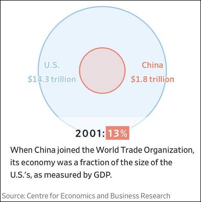 2001年,彼时的中国刚刚加入世贸组织(WTO),以GDP作为衡量标准,中国经济的规模只是美国的一小部分。
