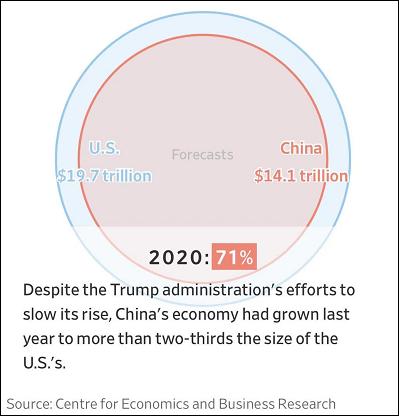 2020年,虽然特朗普政府一再打压,减缓中国发展速度,但中国经济体量已增长至美国的三分之二以上。
