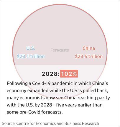 2028年,新冠疫情过后,中国经济将继续增长,美国经济则将下滑,许多经济学家如今认为,中美两国将在2028年这一时刻提前“交棒”。
