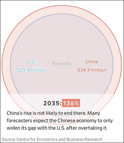 2035年,中国的崛起不太可能就此结束,许多预测人士估计,中国经济在超越美国之后,只会将两者之间的差距越拉越大。