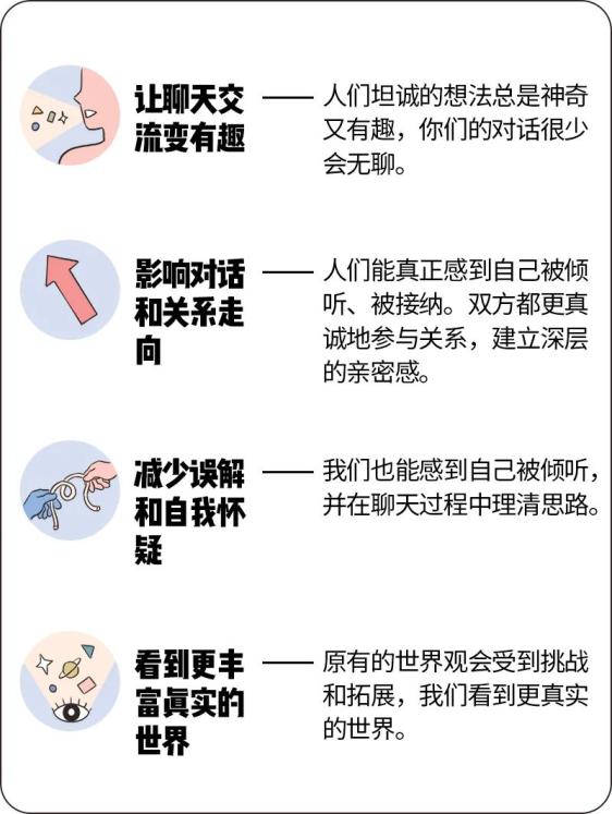 另一方面,我们还要充分关注自己的感受(听到对方的观点后,我产生了哪些想法和反应?受到了什么影响?浮现了哪些新问题?)并将这些与对方沟通,也激发对方新的思考。当我们不带批判地聆听自己,我们能够更清晰地梳理自己的想法,调整和完善自己对世界的认知。