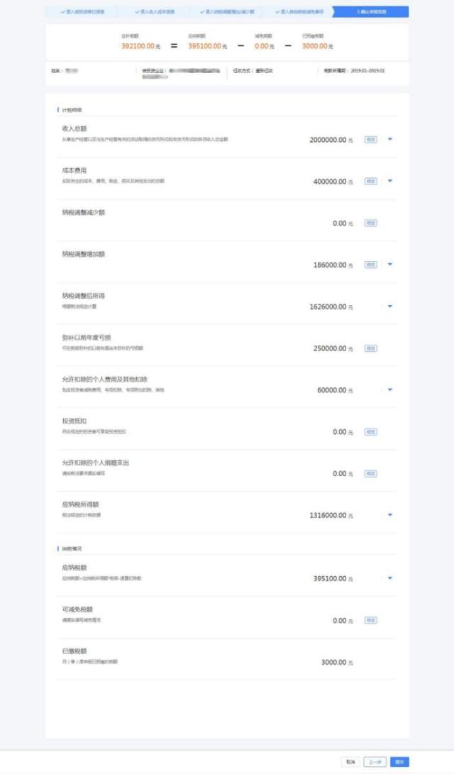 确认申报信息,系统将根据历史申报数据,自动归集需要调增的数据,纳税人还可以额外补充需要调增的数据。其中只有应调整的其他费用、可减免税额(可减免税额附表、可享受税收协定待遇优惠附表)在报表中直接修改,确认数据无误后点击提交,可在申报成功的页面立即缴款或查看申报记录。