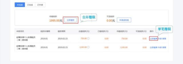 (1) 点击【我要查询】-【申报查询】-【未完成】,选择对应申报项目进行缴税,如有多条未缴款记录可点击【立即缴税】(仅同一个税款所属机关、收款国库的申报可合并缴税);