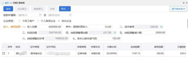 点击【年度汇缴申报】进入申报表填写主界面。若该税款所属期已有申报成功或待反馈的明细记录,则【收入、费用信息】不允许修改。