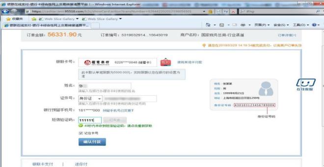 先在浏览器打开的银联缴款页面,录入该缴款银行卡办理时使用的姓名、证件号码和银行预留手机号等信息后点击【确认付款】,缴款成功则会跳转至缴款成功提示界面。