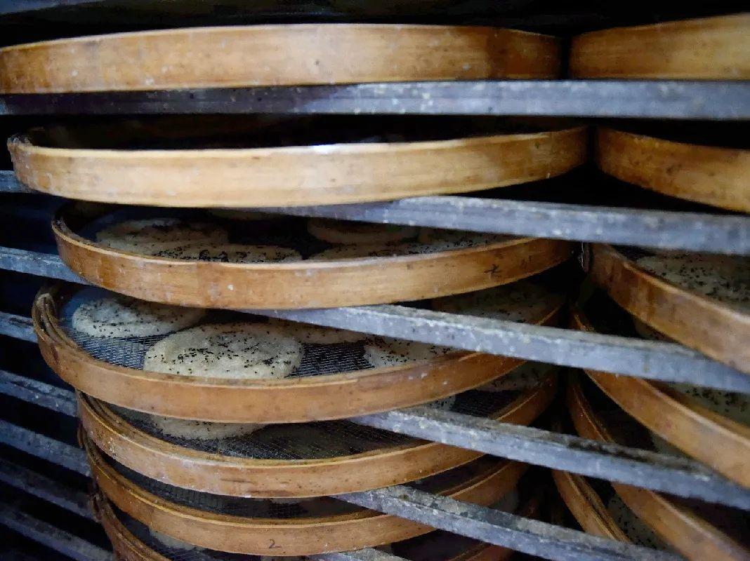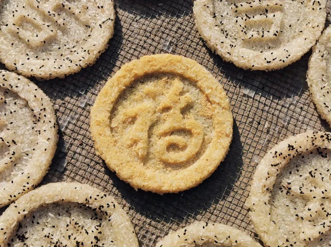 蒸好的糯米要趁热填入刻有吉、福、禄、寿的凹字的木模里打胚成形。“因为量大,做不到以往的反复晾晒了,现在都是放入烤炉烘干糤胚。”李老板的白糤品种颇为丰富,不仅有原味、芝麻味,还有姜蓉味,甚至还有客户自带六堡茶定制了一批茶味的白糤,着实让小记觉得新奇。