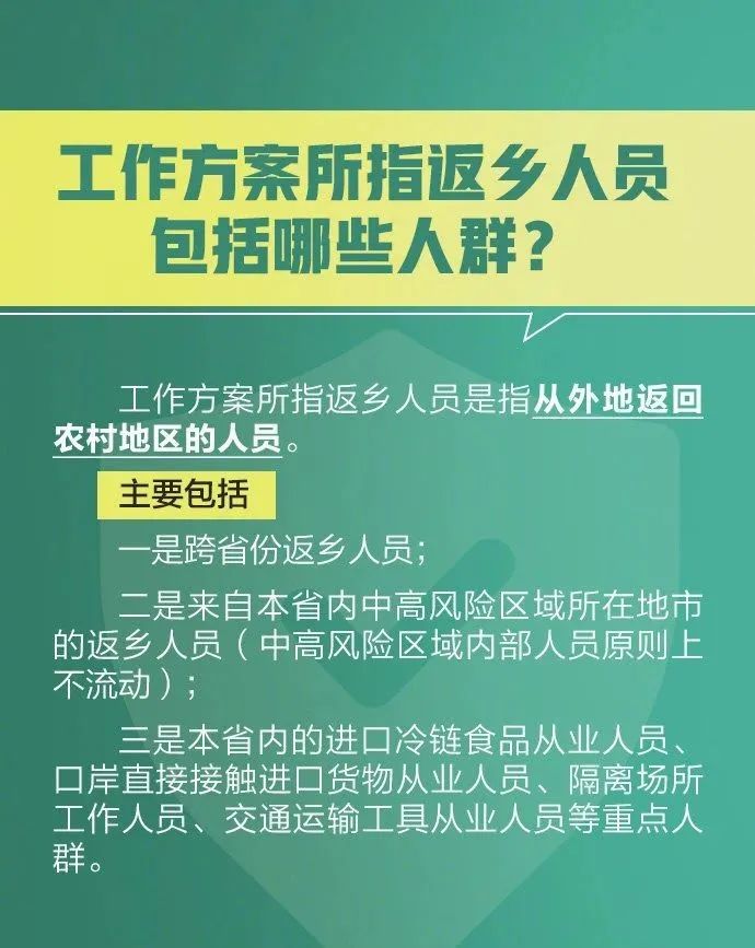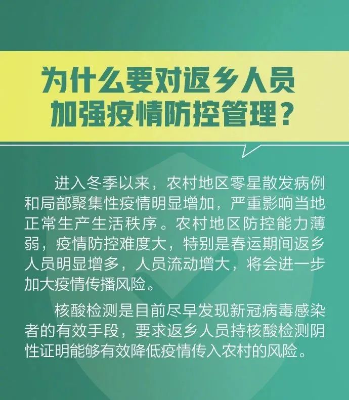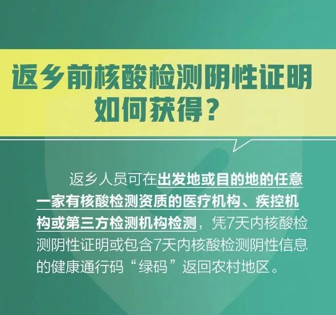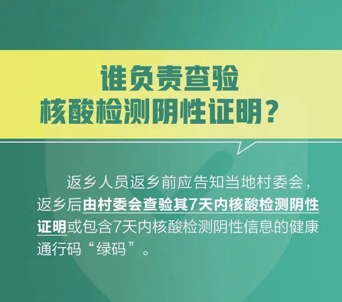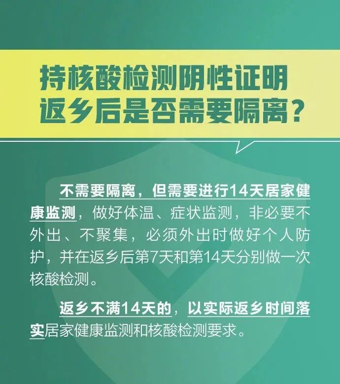 其中,返乡人员需持7天内有效新冠病毒核酸检测阴性结果返乡,返乡后实行14天居家健康监测,期间不聚集、不流动,每7天开展一次核酸检测。
