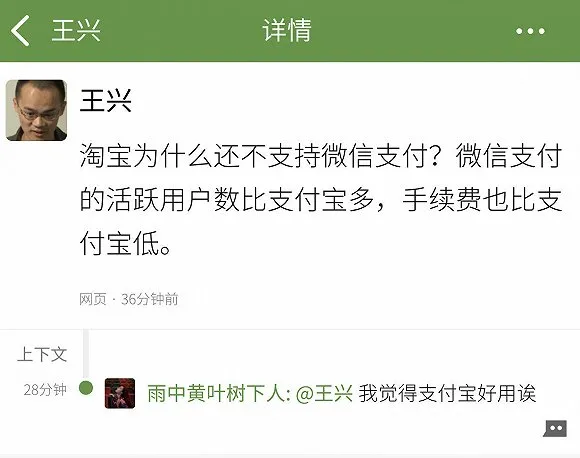 在美团的股东结构中,腾讯作为第一大股东持股比例超过20%,这使美团有底气将阿里系的痕迹踢出自家领地。美团屏蔽支付宝支付方式后,社交媒体遍布用户使用不便的吐槽。王兴为此在饭否发文反驳:淘宝不也没有微信支付?