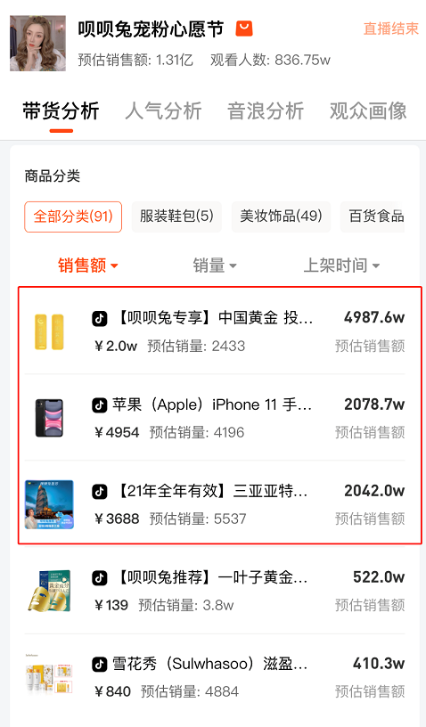 此外,主播倾向于带一些极低利润甚至无利润的硬通货,用于拉升销售额以及提高对品牌方议价能力,如价格远低于线下的金条、苹果手机等等。