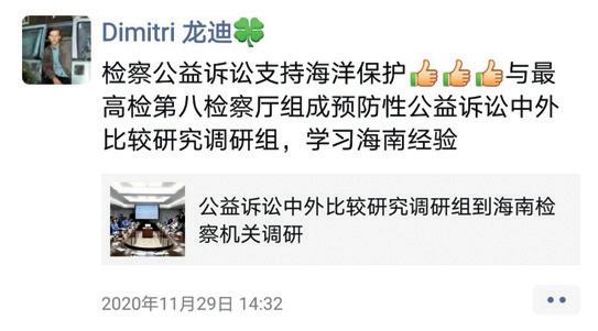 龙迪的微信朋友圈, 不时有中文 的中国公益诉讼检察 “广告”。(来源 :作者供图)