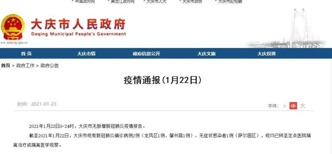截至2021年1月22日,大庆市现有新冠肺炎确诊病例2例(龙凤区1例、肇州县1例),无症状感染者1例(萨尔图区),现均已转至定点医院隔离治疗或隔离医学观察。