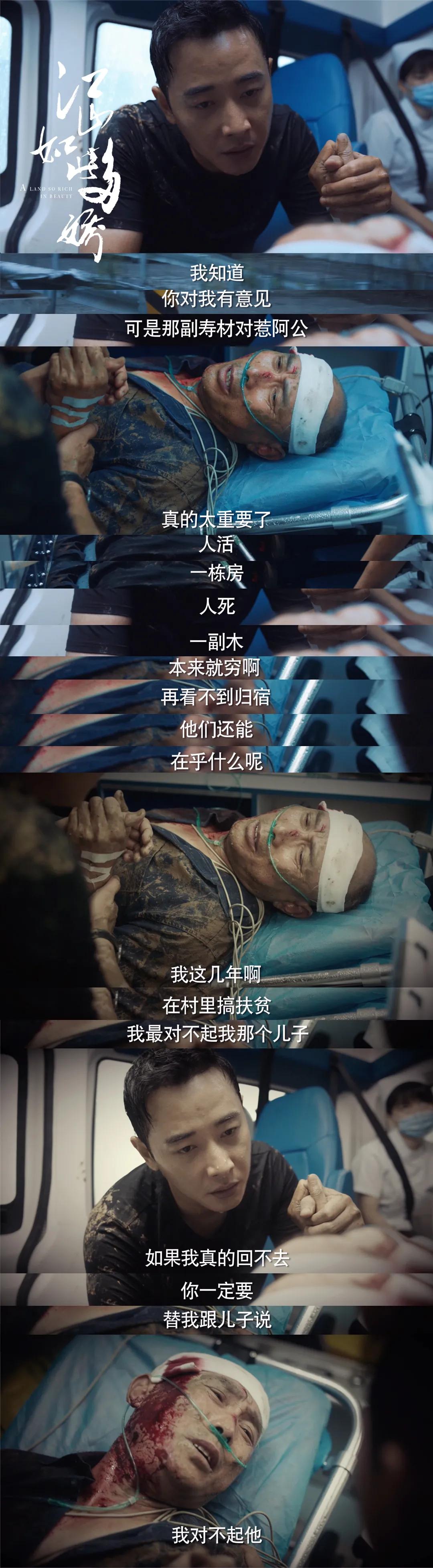 像是在剧情一开篇,龙书记出场不久就惨遭意外,将死之际说出自己遗愿的段落,濮泉生颤抖的身躯,实在太好哭。