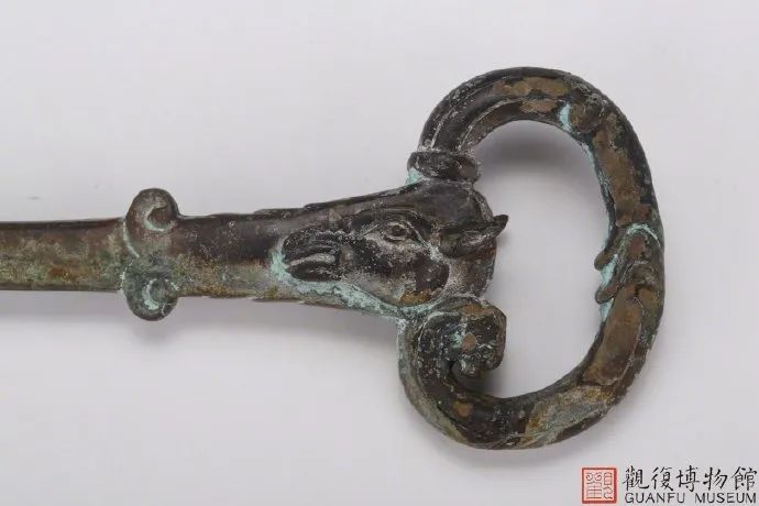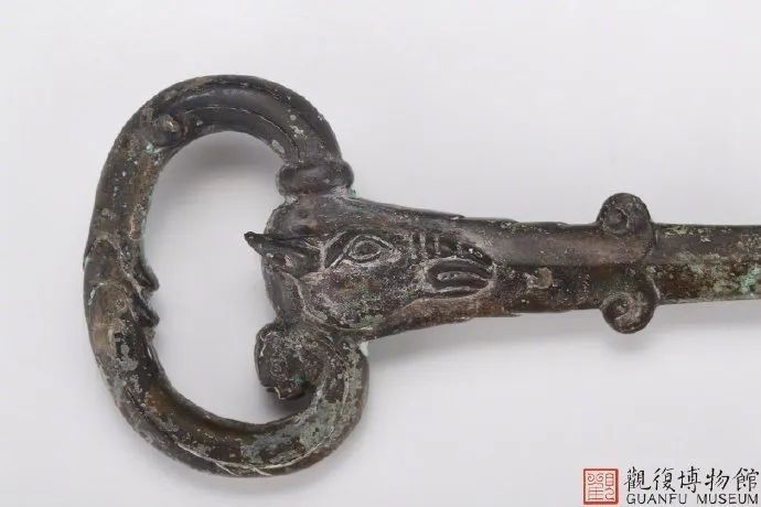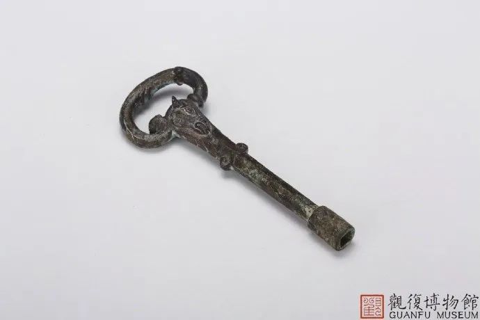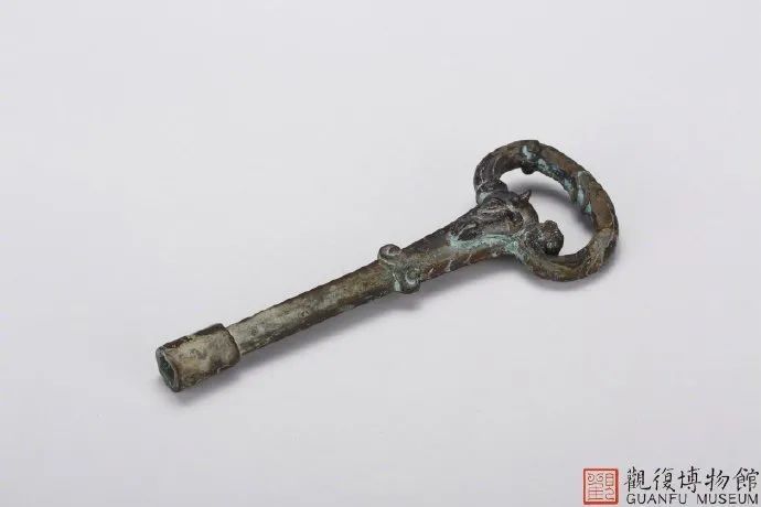 琴轸,是古琴右首下方调弦的小柱。战汉时期,琴轸短小,且多为青铜质或者木质,故需使用琴轸钥嵌套于琴轸之上,加以调节。这件器物整体造型呈柱形,自下至上可以分为三部分——底部圆筒状,内有一方形凹槽,中部为细长圆柱,与钥匙柄端连接处装饰有一回头兽首,造型生动,顶端为一环,可供穿系。