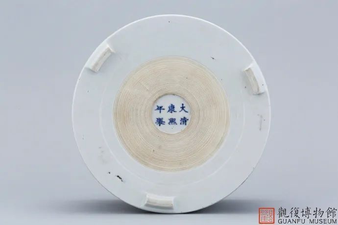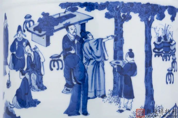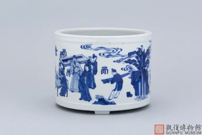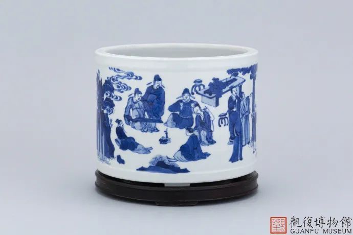 这是一件清朝康熙年间的笔筒,敞口、直壁,口径与高相若,下承三条状足,玉璧底,中间以青花书“大清康熙年制”六字三行楷书款。笔筒环绘“十八学士图”。十八学士是唐太宗李世民做秦王时招纳的贤才,他们为其出谋划策,先后平定了王世充,打败了刘黑闼,最后平定天下。在工匠的画笔下,这些人动作各异,神态自然——或焚香抚琴,或品茶弈棋,或高谈阔谈……