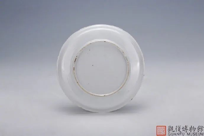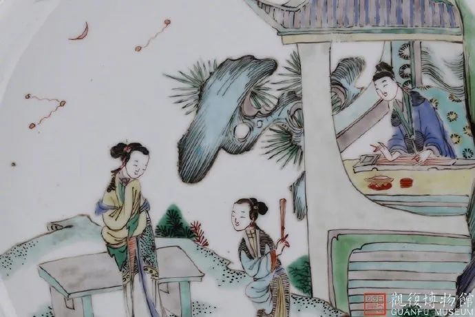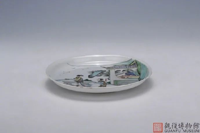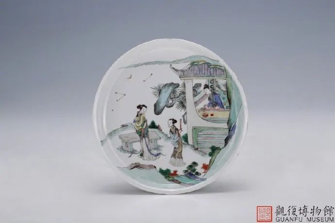 这是一件康熙时期的五彩作品——折沿、浅腹、圈足。内外施白釉,背面光素无纹,盘心以五彩绘《西厢记》中“听琴图”的桥段:月光下,张生在亭中抚琴,红娘手拿折扇,崔莺莺则右手抬起,低头作娇羞状。明末清初,戏曲表演流行,加之版画的出现,对戏曲故事出现在瓷器上起了推动作用。这类反封建礼教故事的盛行,也体现了明末清初人们对个性解放的追求。